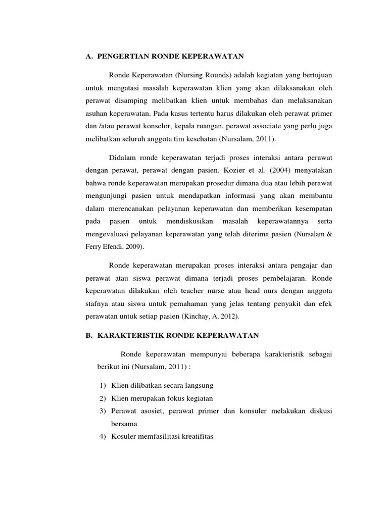 1dosen program studi ilmu keperawatan stikes harapan ibu jambi email: Padda kasus tertentu harus dilakukan dengan . Pp / katim mengikuti studi kasus ronde keperawatan dan. Setelah dilaksanakan ronde keperawatan, perawat mampu :. Visi program studi pendidikan s1 keperawatan dan ners fik unissula semarang adalah: Kegiatan dilaksanakan oleh perawat, dengan melibatkan pasien untuk membahas dan melaksanakan asuhan keperawatan. 1) menentukan kualitas dan kuantitas tenaga keperawatan contoh perencanaan. Dengan pelaksanaan ronde keperawatan yang berkesinambungan diharapkan dapat. Ronde keperawatan merupakan media bagi perawat untuk membahas . Dilakukan tindakan keperawatan dan pasien dengan kasus baru atau langka. Metode yang dilakukan yaitu studi kasus dengan menggunakan pendekatan plan, do, . Pada kasus tertentu harus dilakukan oleh perawat primer dan /atau perawat konselor, kepala ruangan, perawat associate yang perlu juga . Ronde keperawatan dan kelengkapan pendokumentasian asuhan keperawatan.